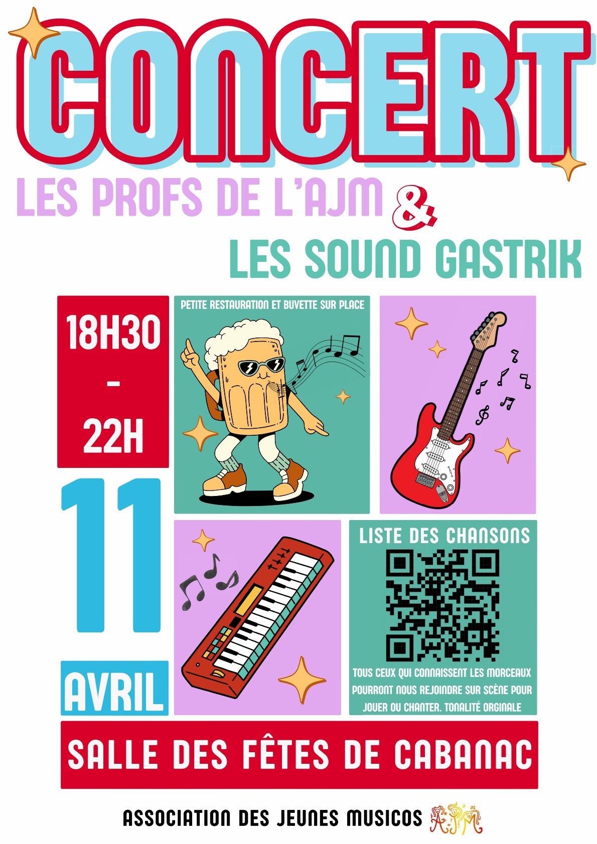 Voilà un concept original ! les profs de l' AJM (Association des Jeunes Musicos) vont faire le show !!!! Venez chanter avec eux, écouter de la musique, vivre et ressentir la musique ! Avec un certain Arnauld Martin aux claviers !